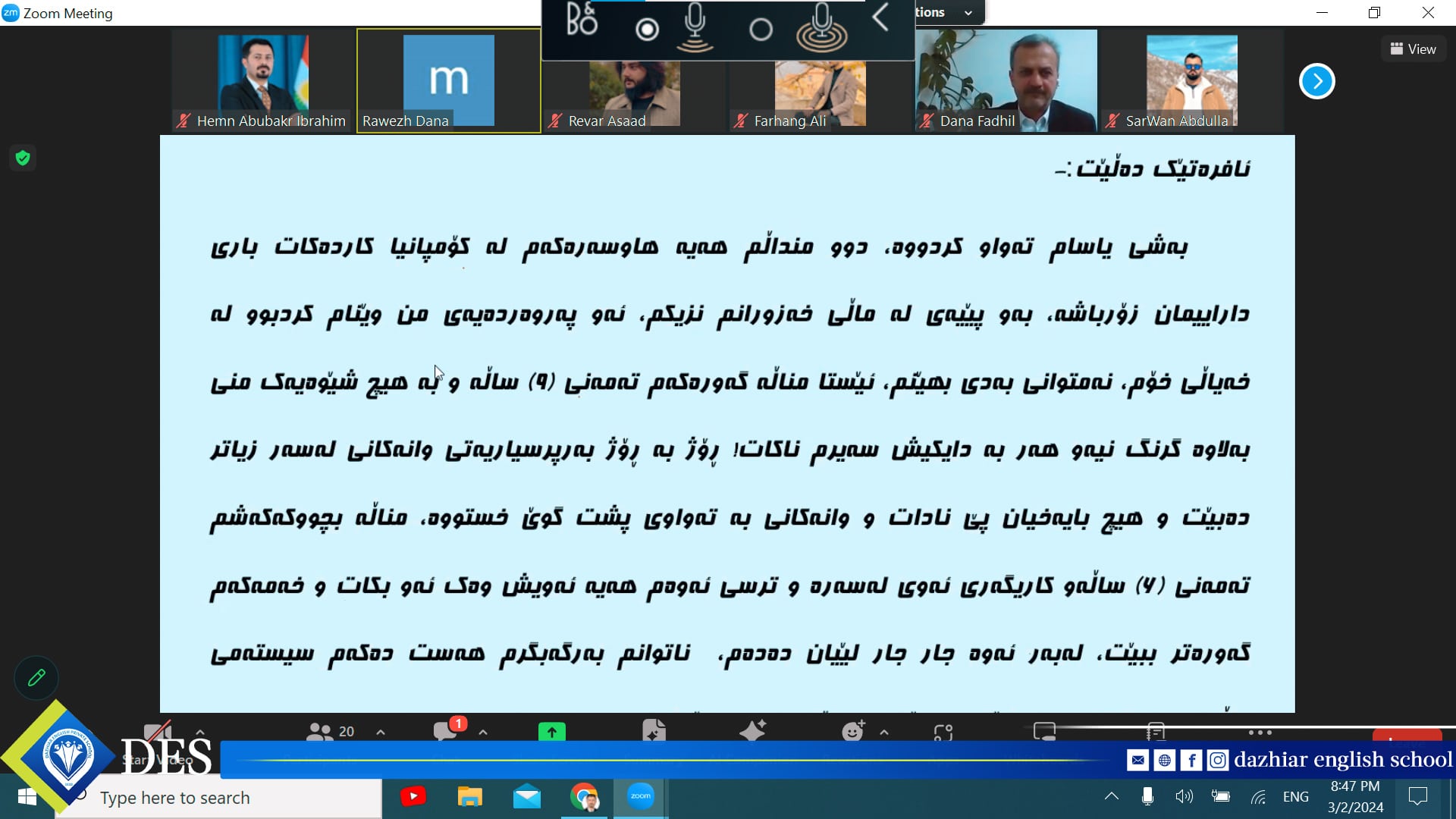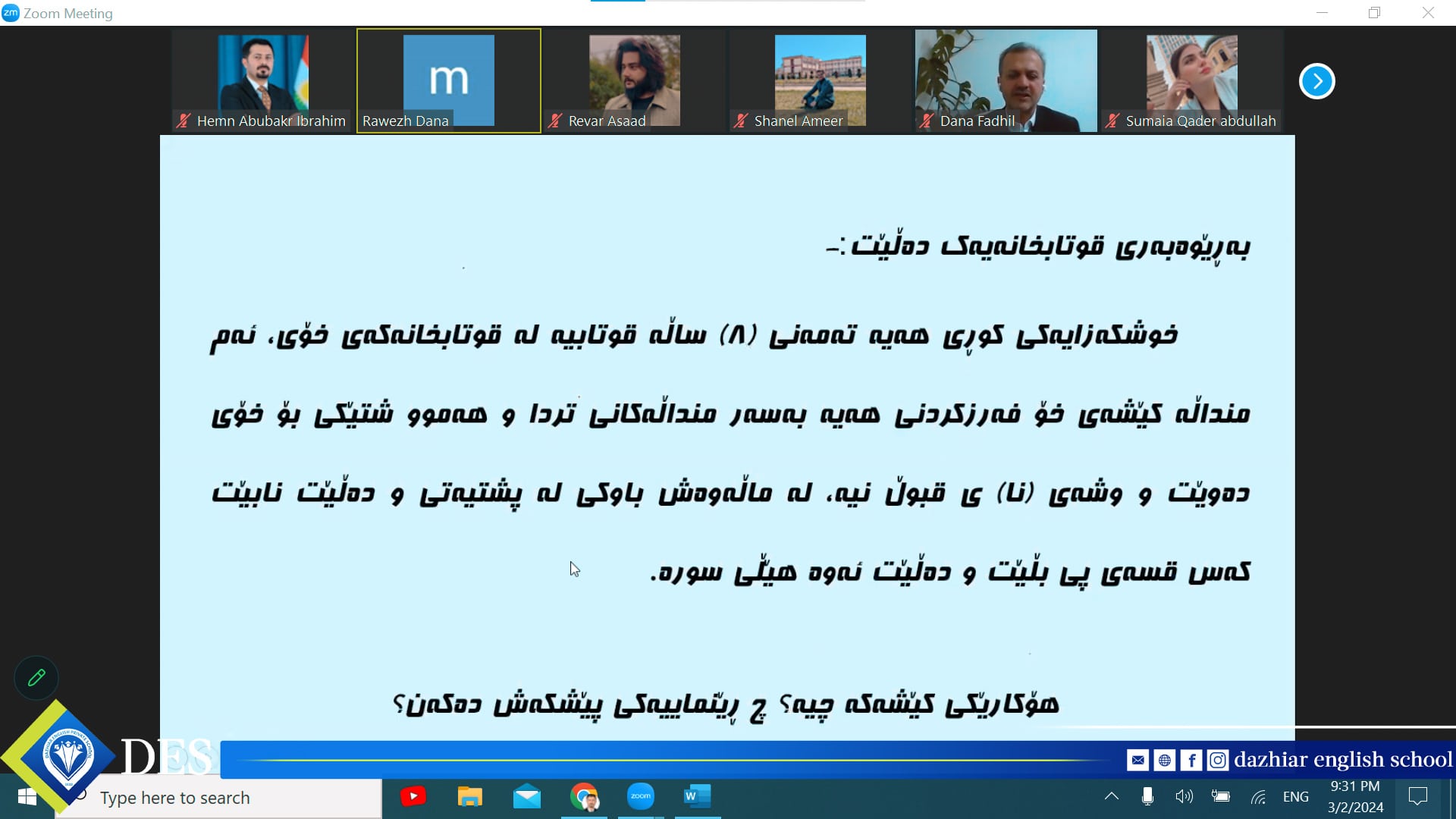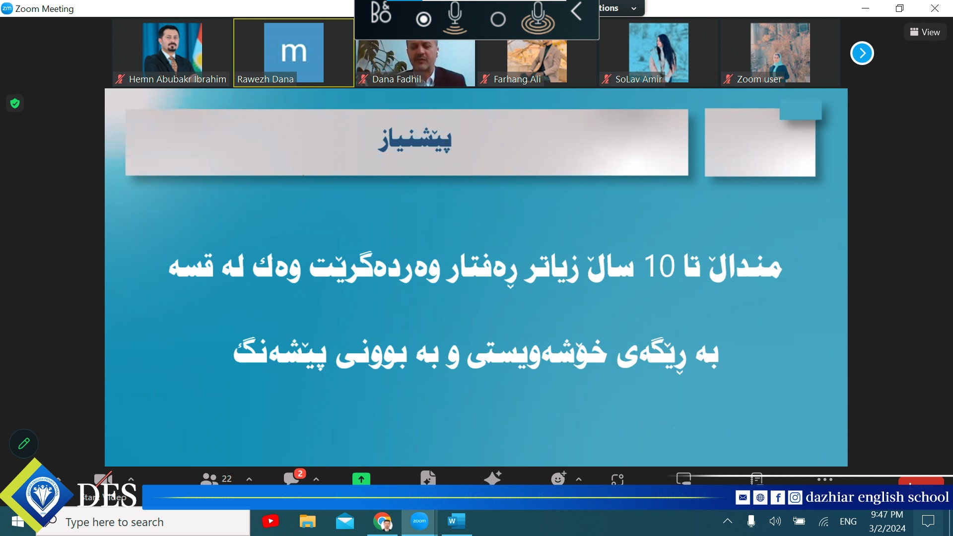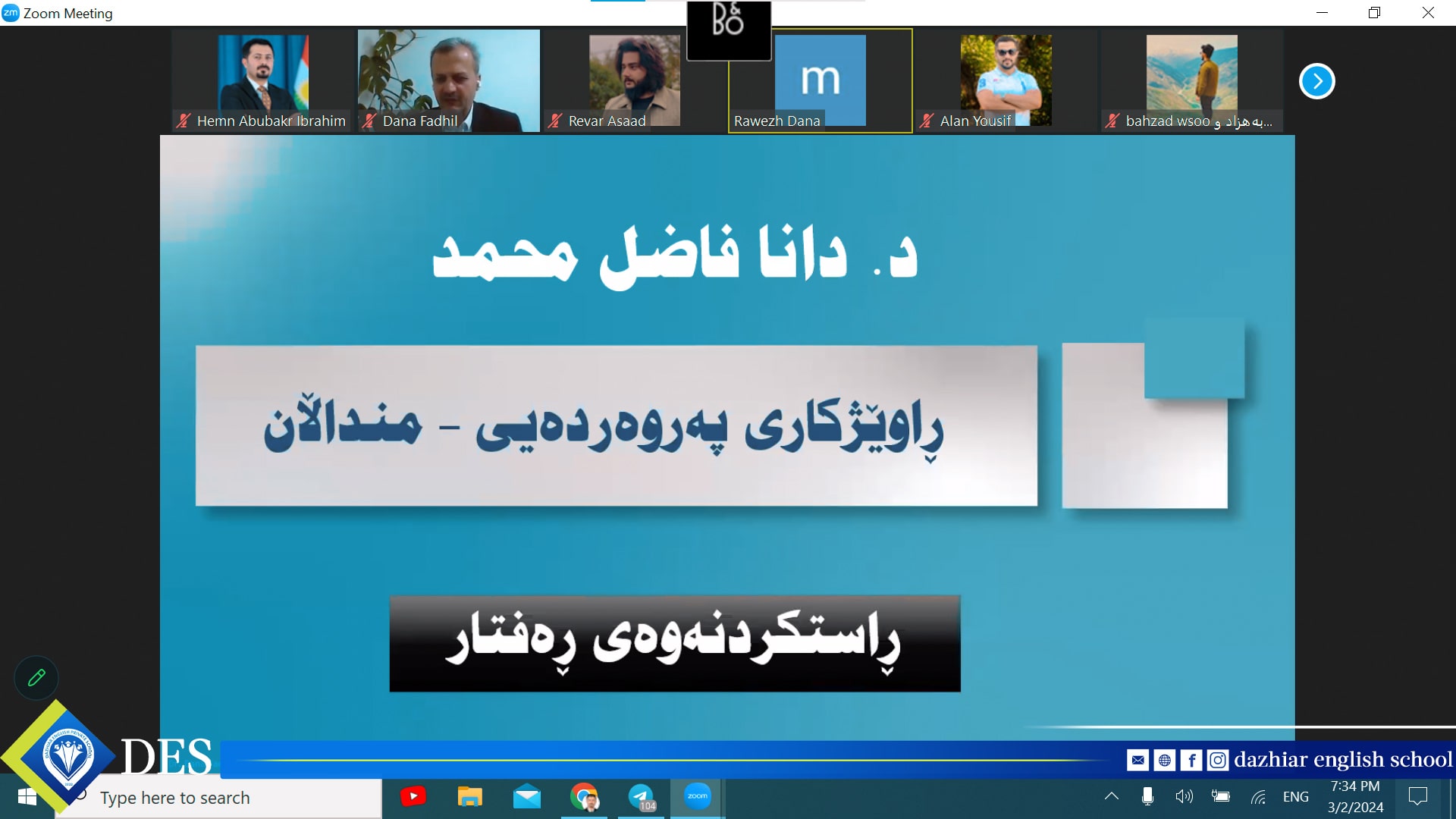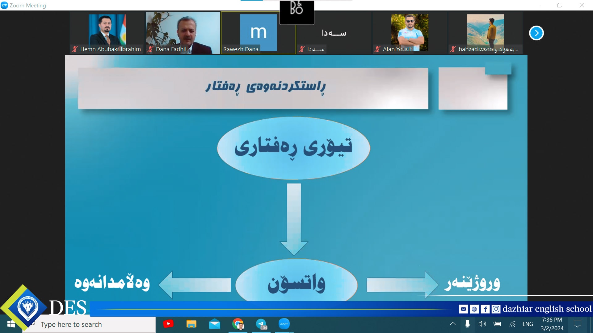 مامۆستای زانا و کارساز پایەی یەکەمە لە پێشکەشکردنی فێرکردنێکی کاریگەر و مۆدێرن، لەسەر ئەم بنەمایە, زۆر بەڕێز (د. دانا فــاضــل محمد - ڕاوێژکاری پەروەردەیی منداڵان) بەشێوەی ڕاستەوخۆی سەرهێڵ وۆرکشۆپێکی بەپێزی پێشکەشی ستافی مامۆستایانی قوتابخانەکەمان کرد دەربارەی ( ڕاستکردنەوەی ڕەفتار Behavior Modification).